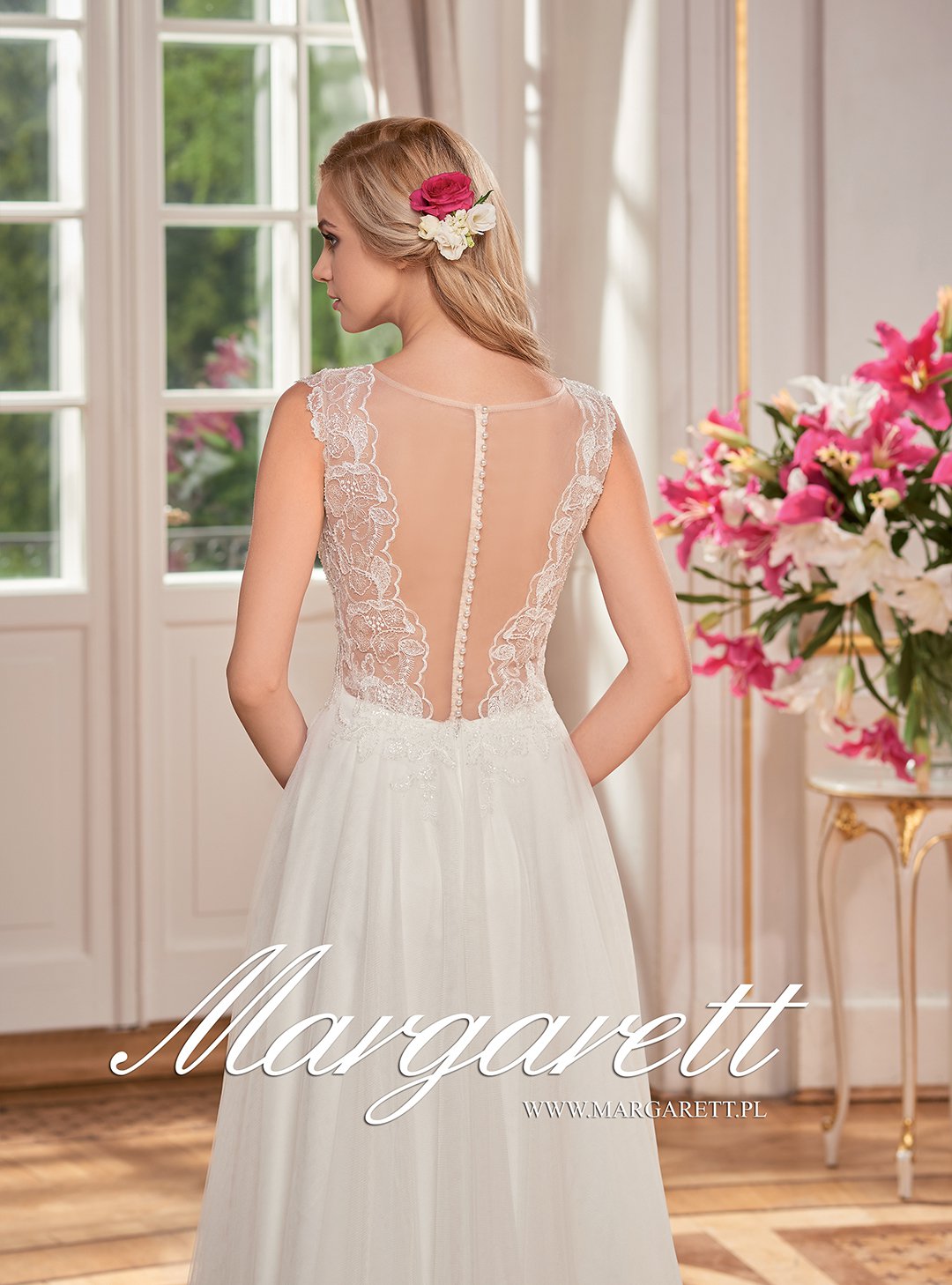 Przód sukni z dekoltem umiarkowanie dużym, tył prześwitujący odsłania plecy.