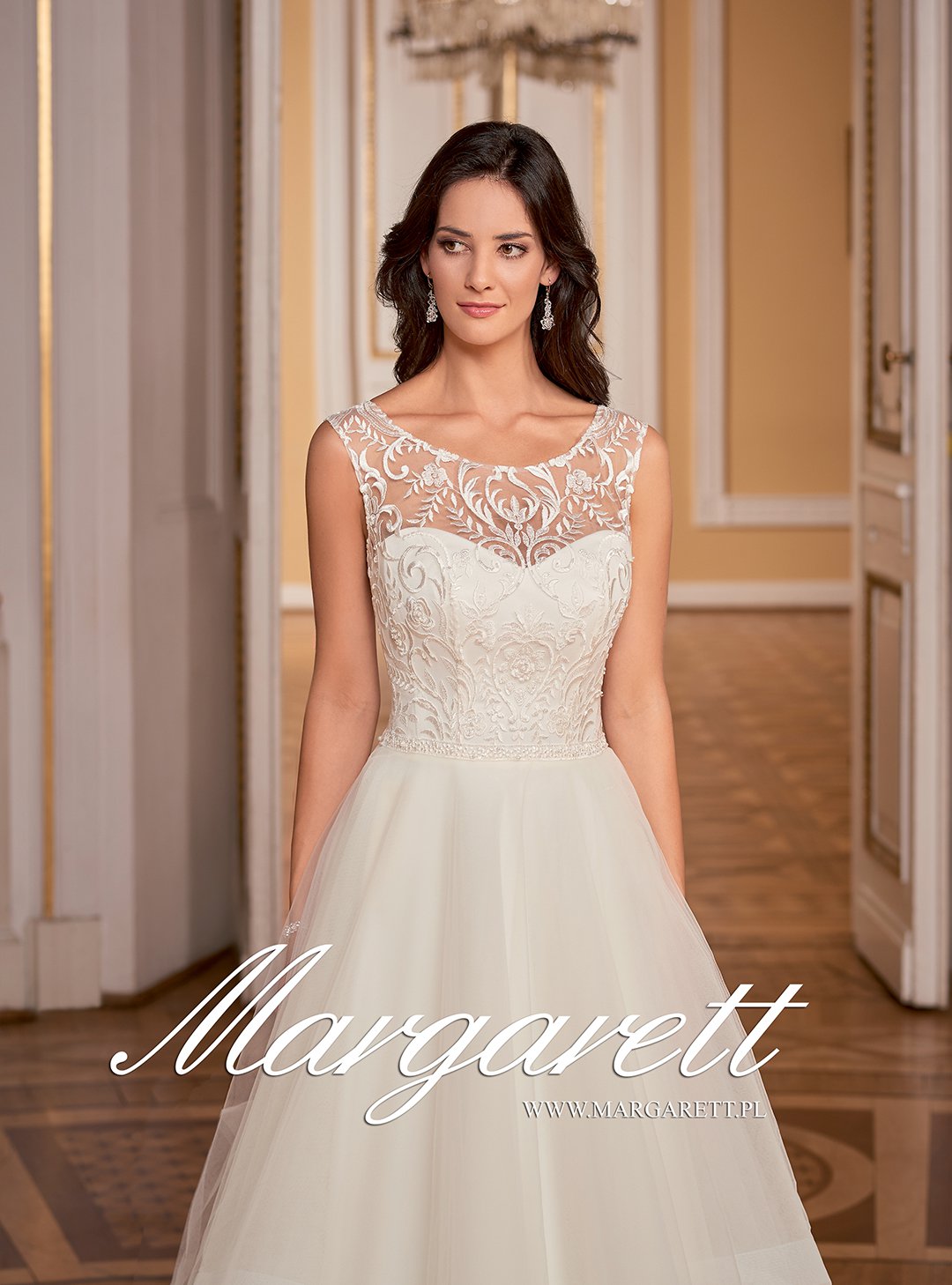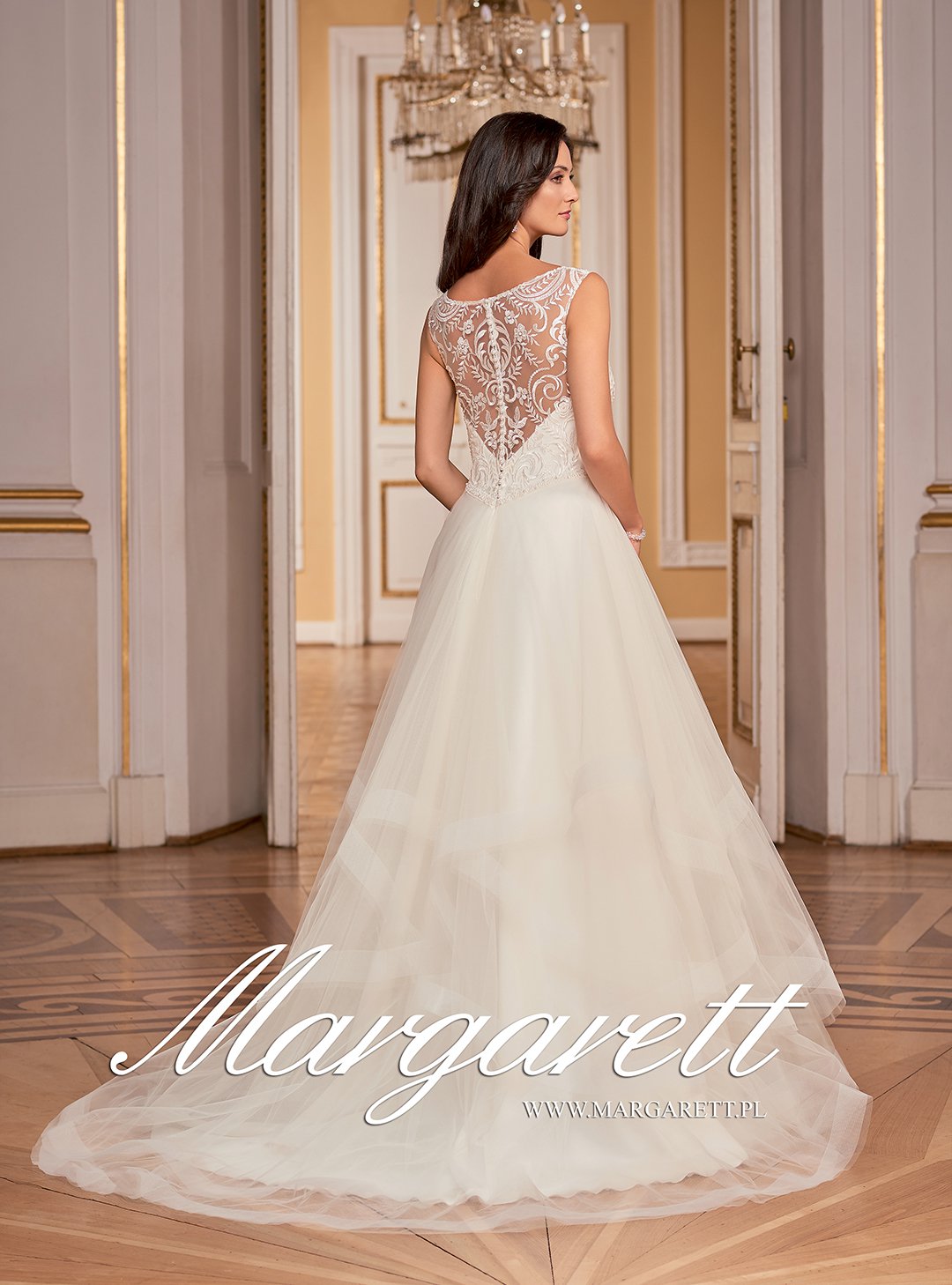 Góra sukni ślubnej Nenufar wykonana jest z haftu o wyjątkowo ciekawym, geometrycznym wzorze, który jest dobrze widoczny na prześwitach.