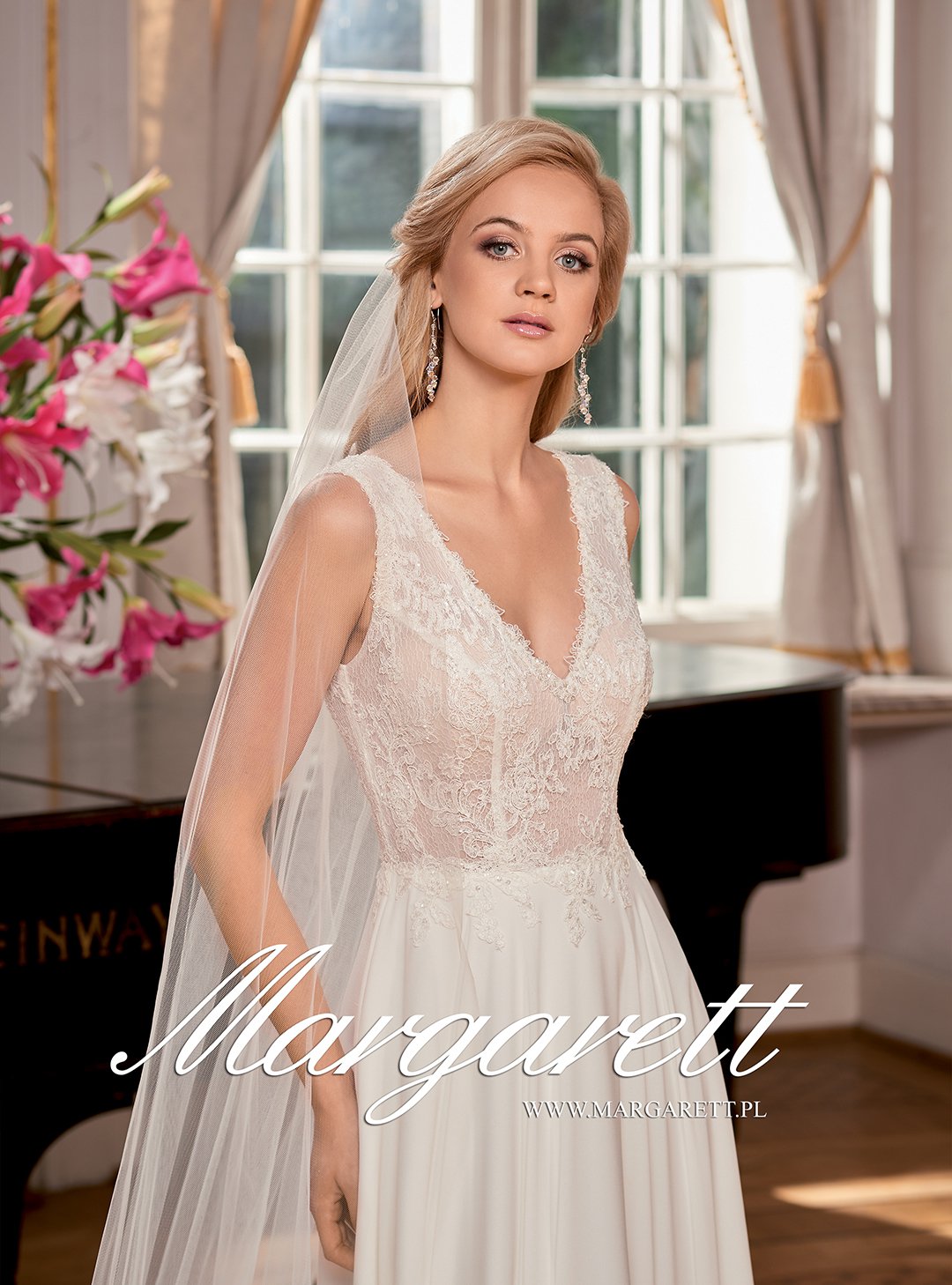 Natomiast dół sukni jest szeroki i wykonany z delikatnej i zwiewnej żorżety.
