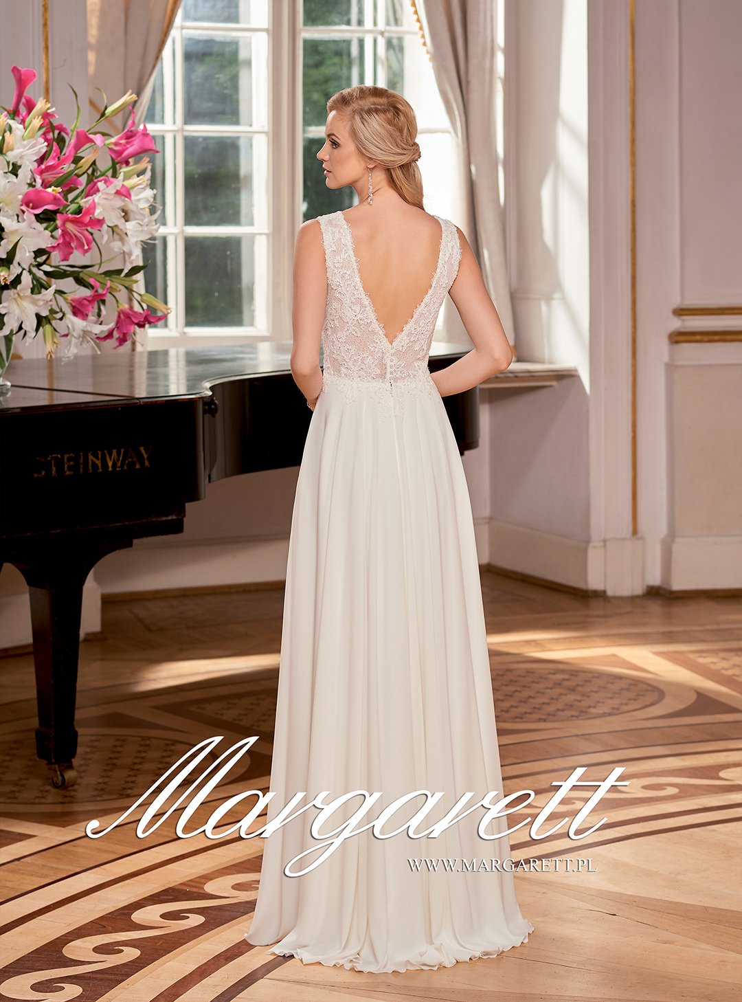Nicole to suknia ślubna z wyszczuplającymi, długimi dekoltami.