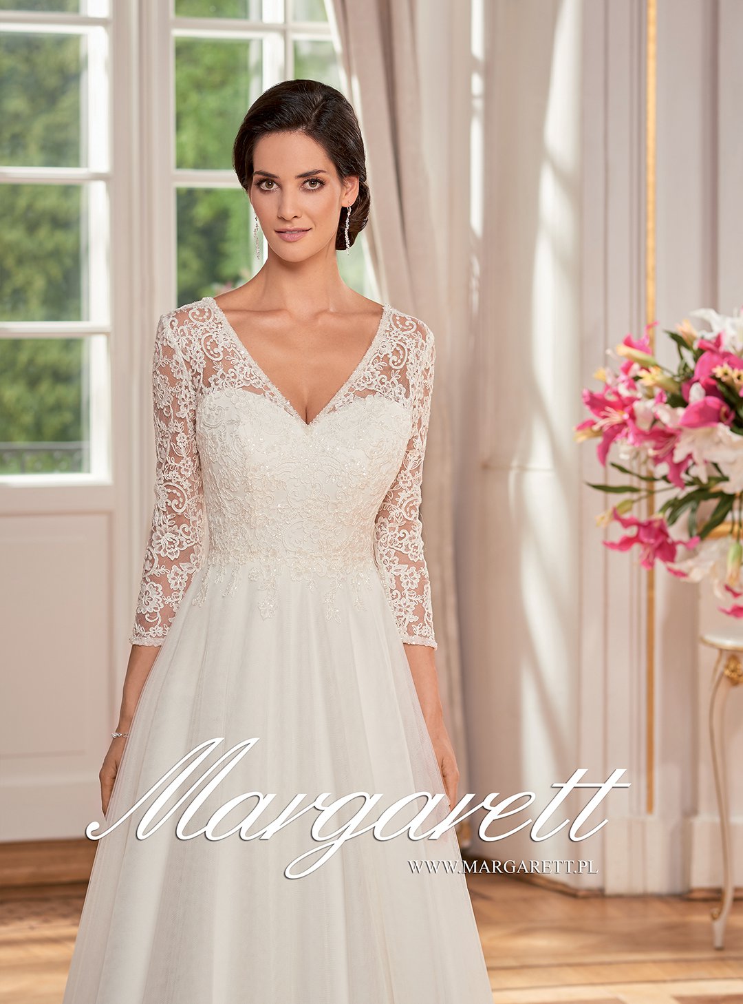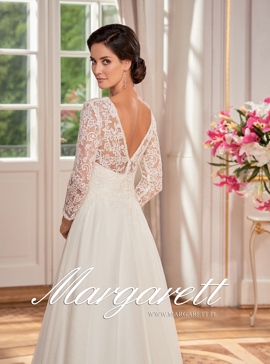 Długi rękaw koronkowy i duże podłużne dekolty nadają sukni ślubnej elegancki wymiar.