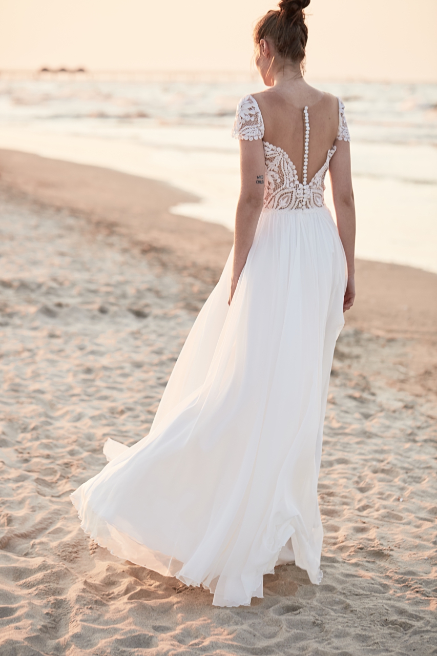 Suknia ślubna w kształcie litery A wykonana z koronki i jedwabiu. Przód pokryty koronką. Delikatne, koronkowe rękawki, opadające na ramiona. Plecy osłonięte tiulem, zapinane na guziczki. Spódnica ze zwiewnego jedwabiu.