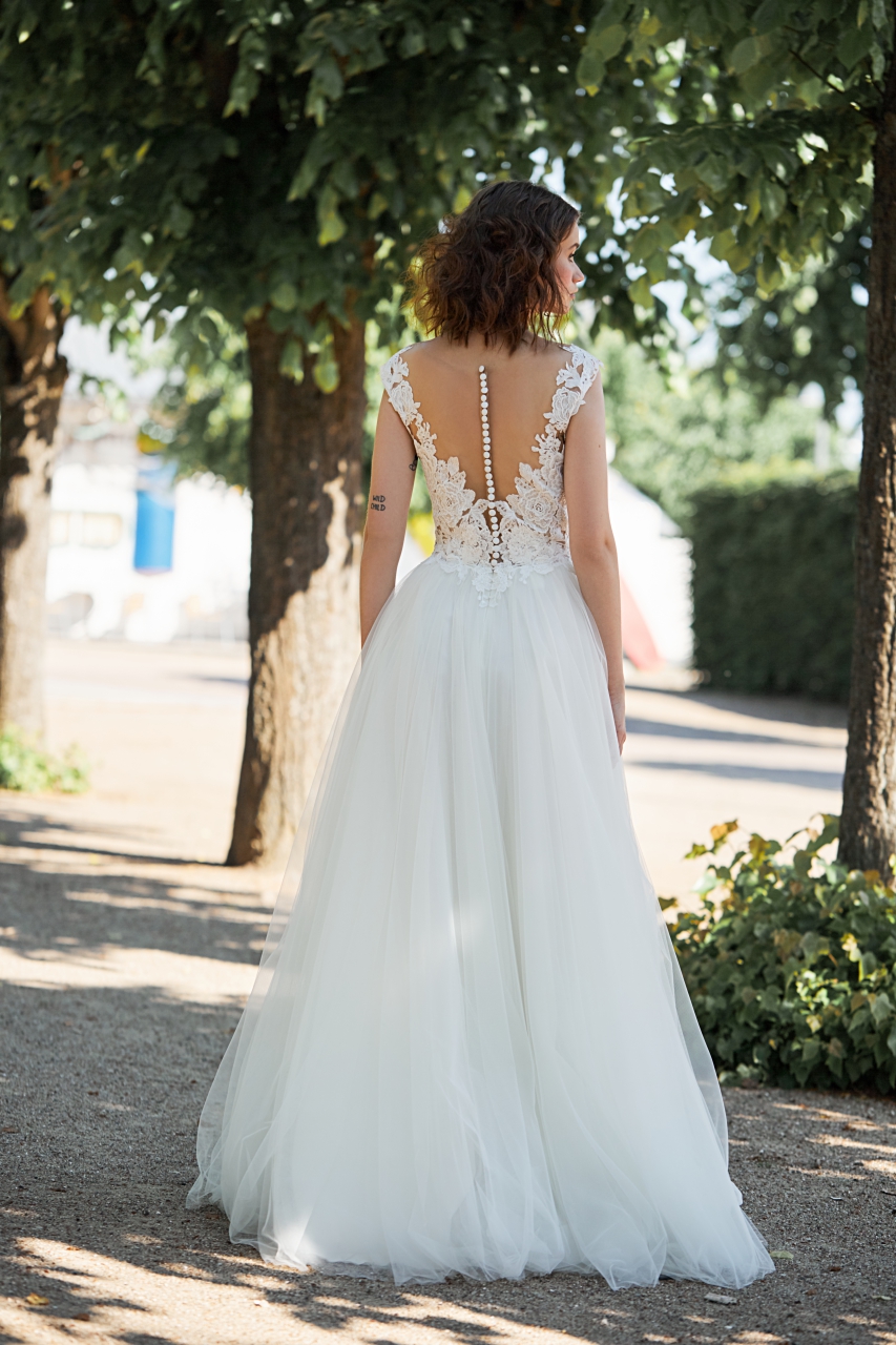 Suknia ślubna w kształcie litery A. Koronkowa góra na grubszych ramiączkach z dekoltem V, schodzącym aż do lini talii. Plecy okryte tiulem i koronką z guziczkami. Dół sukni z lekkiego, zwiewnego tiulu włoskiego.