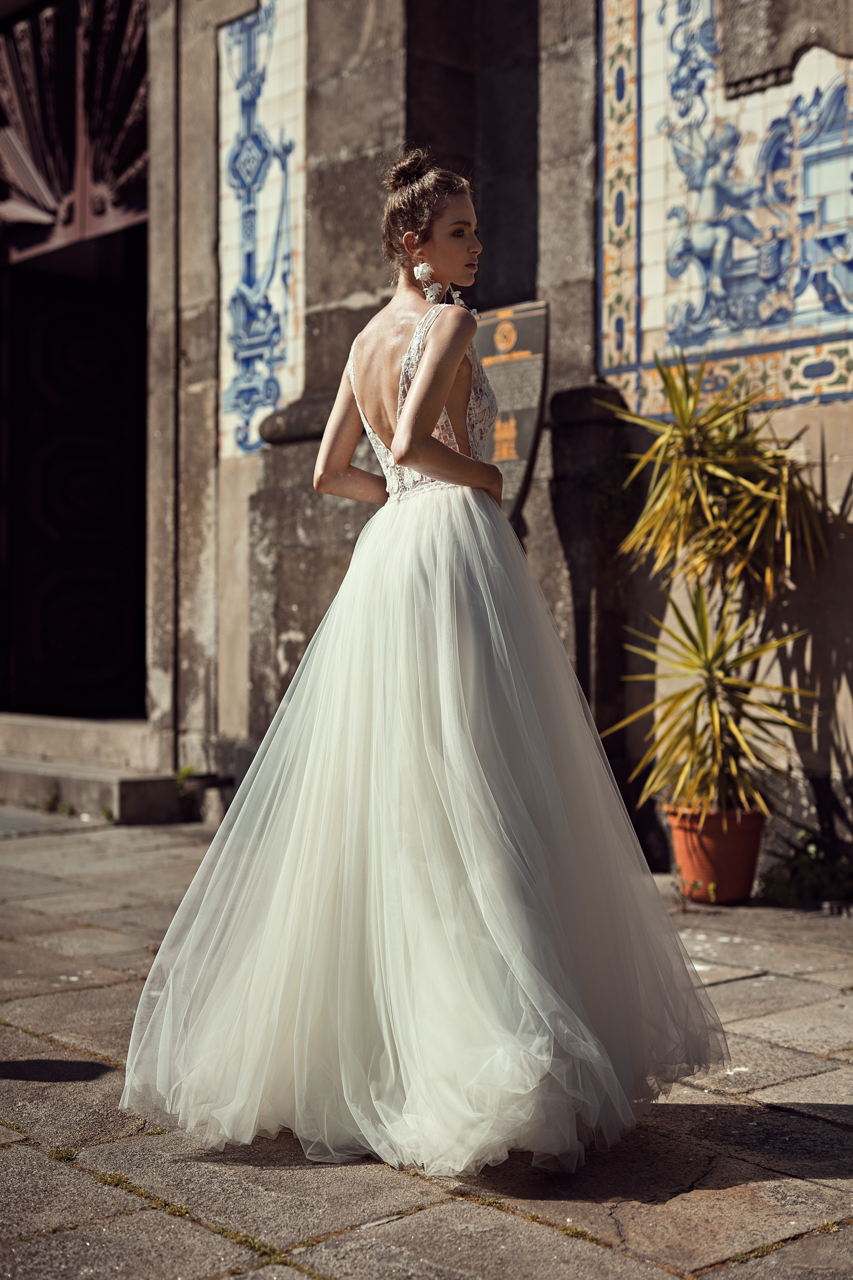 Suknia z koronkową górą na ramiączkach. Dekolt i plecy głęboko wycięte w literę v. Dół sukni z kilku warstw tiulu.
