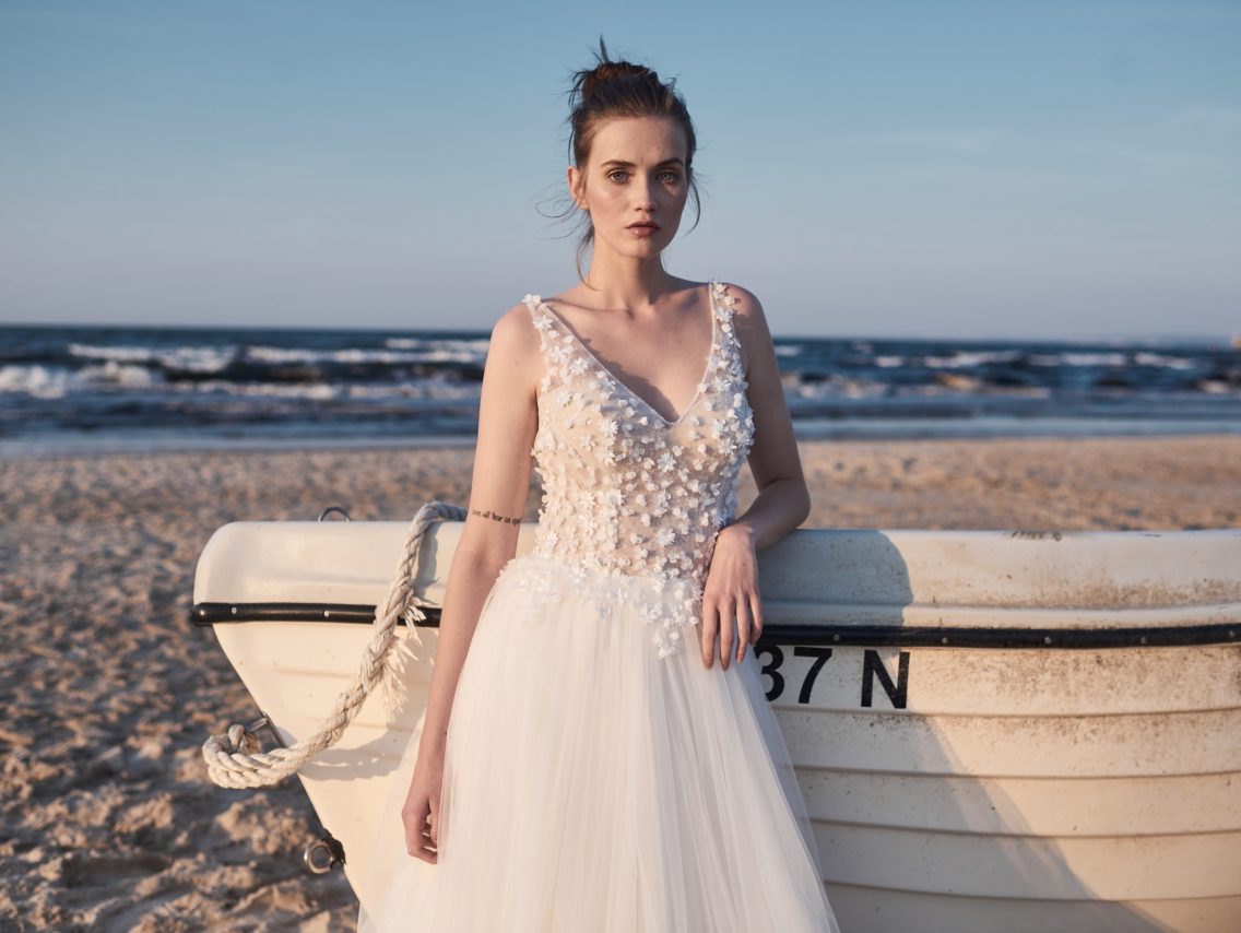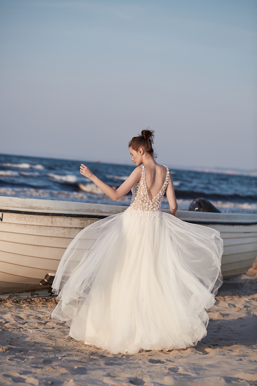 Suknia w kształcie litery A. Lekka, zwiewna propozycja. Dekolt i plecy wycięte w literę V. Góra z delikatnym efektem 3D – kwiatki na tiulu, które delikatnie rozchodzą się na spódnicę sukni. Dół ze zwiewnego tiulu włoskiego