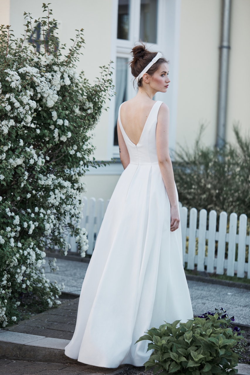 Klasyczna, bardzo elegancka suknia z prążkowanego żakardu. Dekolt i plecy wycięte w kształt litery V. Dół sukni delikatnie plisowany. Opcja z uroczą kokardką w pasie.