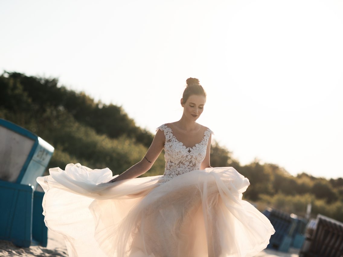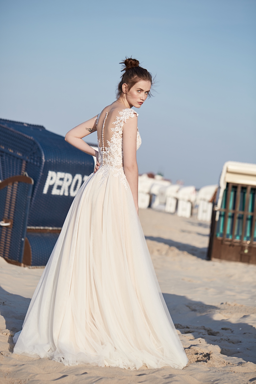 Suknia ślubna w kształcie litery A. Dekolt w kształcie litery V. Góra sukni z pięknej koronki z szerszymi ramiączkami. Plecy z przeźroczystego tiulu zapinane na guziczki. Dół z kilku warstw włoskiego tiulu.