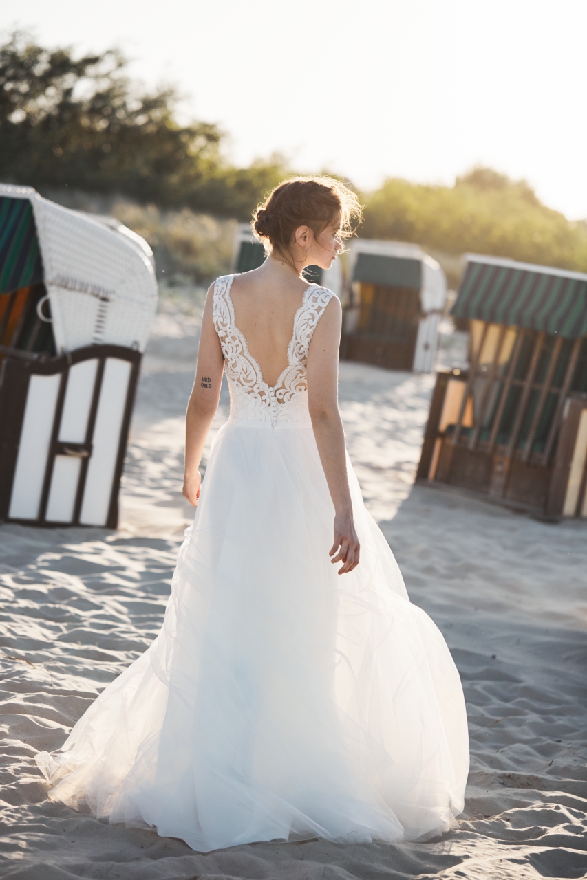 Suknia ślubna w kształcie litery A. Góra wykonana z koronki. Dekolt w kształcie serca, na grubszych ramiączkach. Plecy głęboko wycięte. W talii delikatny paseczek. Dół sukni tworzą zwiewne warstwy tiulu włoskiego.