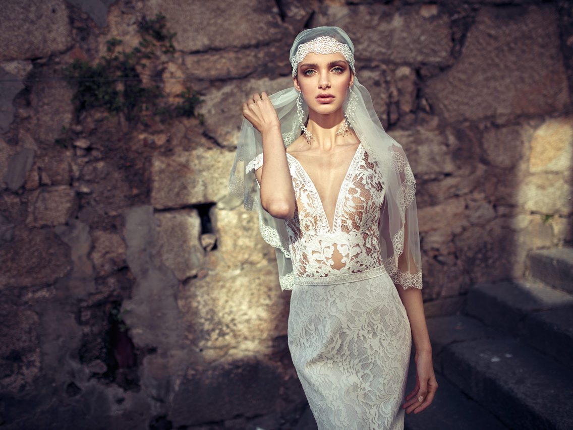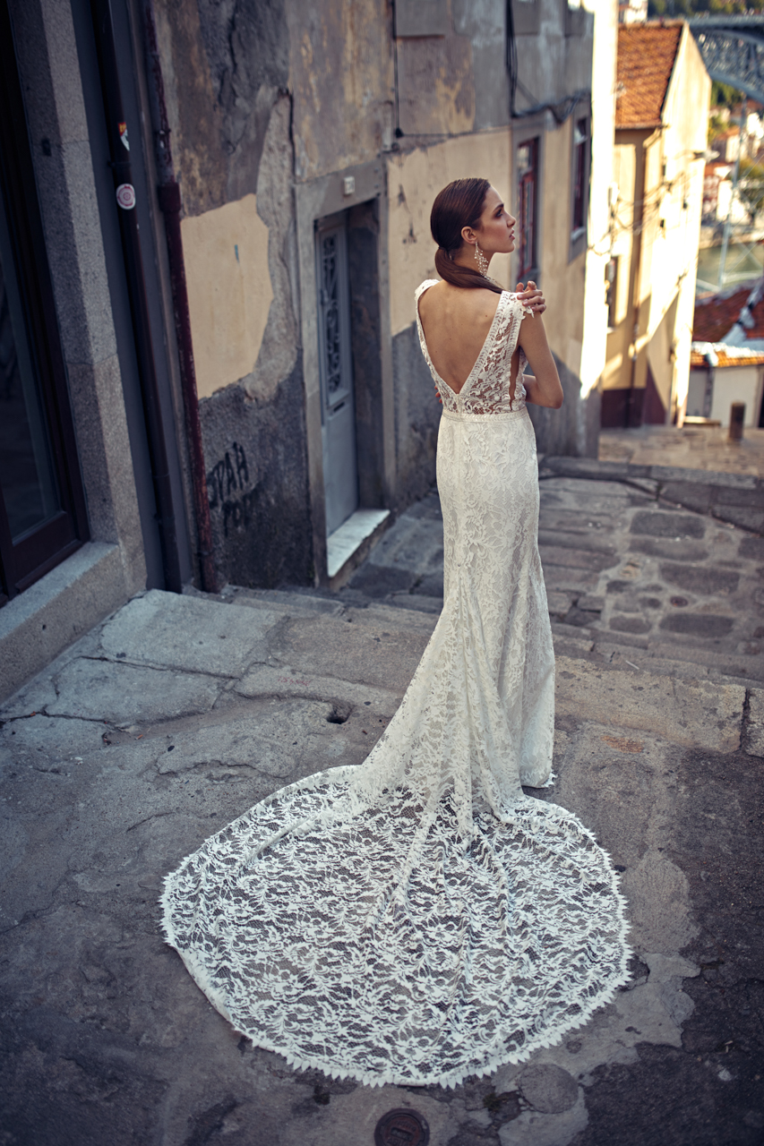 Suknia ślubna z koronki W kształcie rybki z długim, bardzo efektownym trenem. Dekolt i plecy wycięty w literę V.