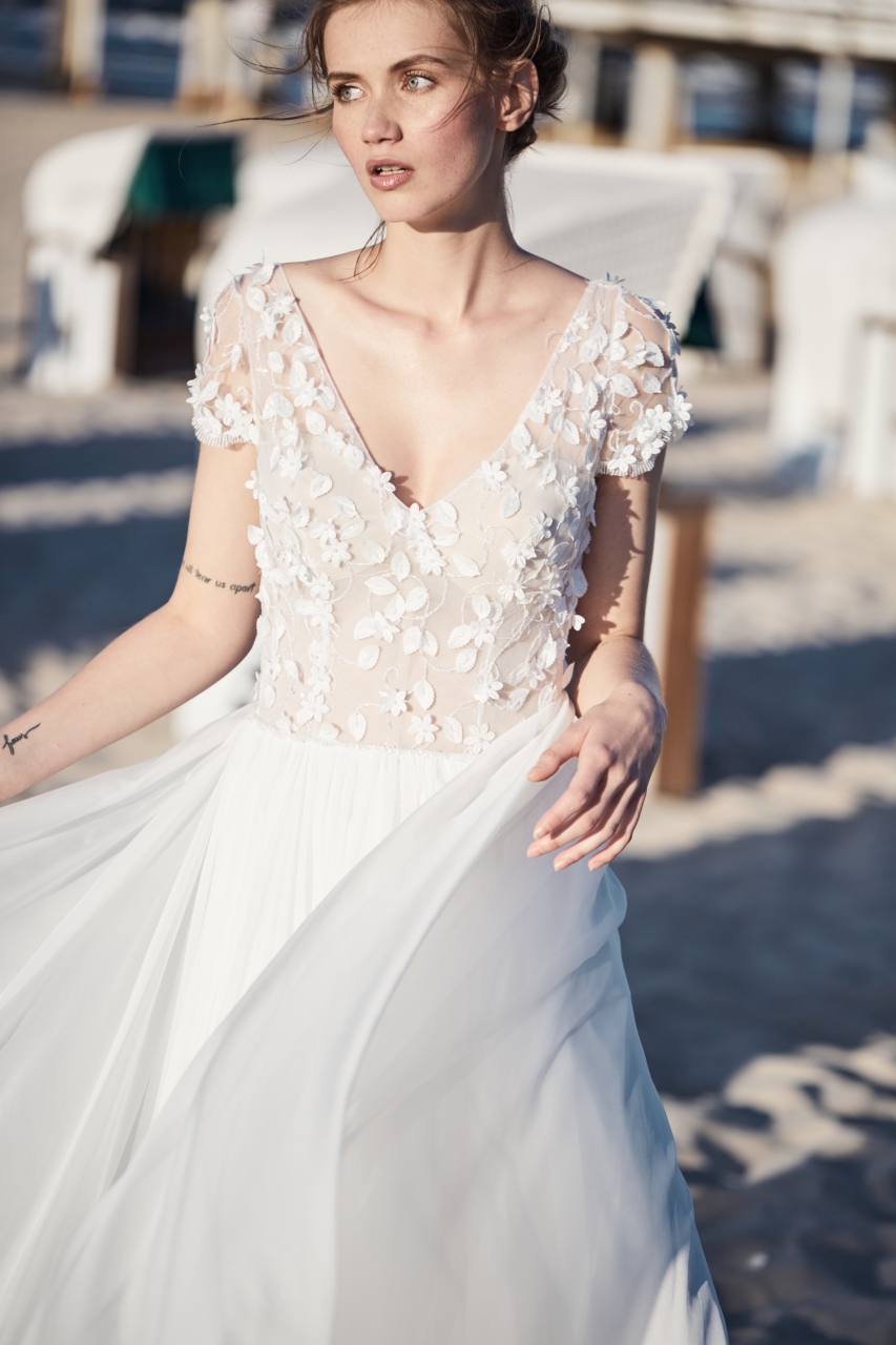 Suknia w kształcie litery A. Lekka, zwiewna propozycja. Dekolt i plecy wycięte w literę V. Góra sukni z krótkim rękawkiem, z delikatnym efektem 3D. Dół ze zwiewnego, lekkiego jedwabiu.