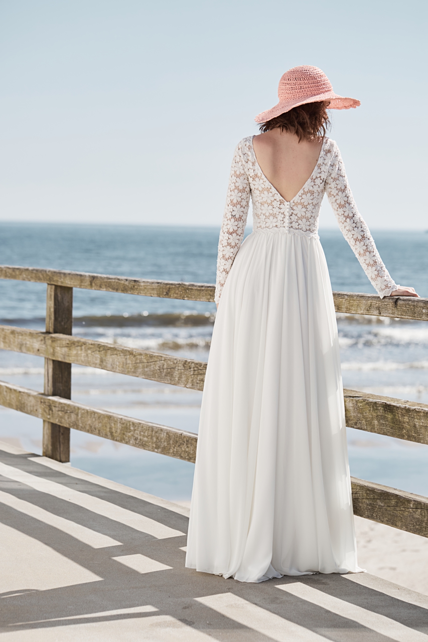 Połączenie koronki i muślinu. Górę sukni tworzy bardzo charakterystyczna, zdobiona koronka z dodatkiem delikatnych perełek. Długi rękaw i zabudowany dekolt. Pięknie wycięte plecy w kształt litery V. Propozycja bardzo urocza i delikatna.