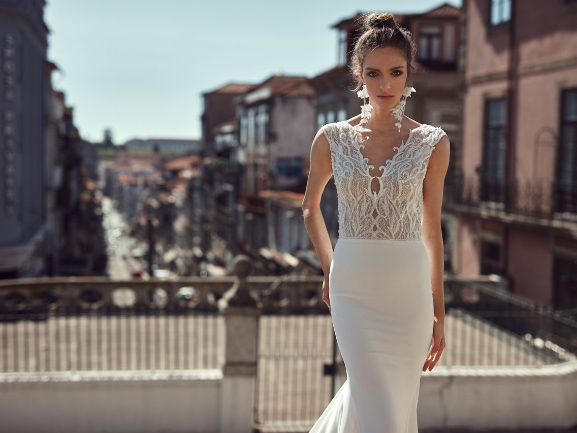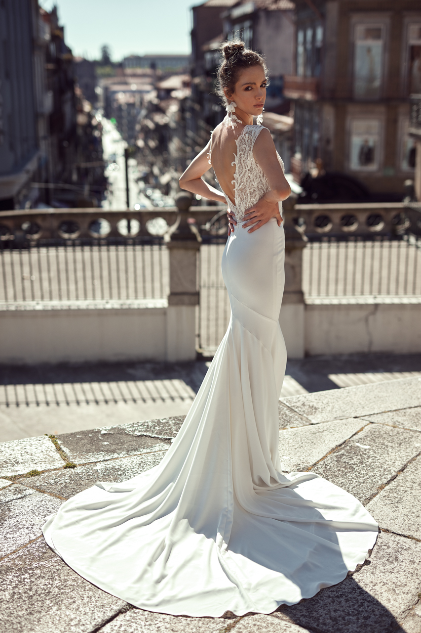 Suknia ślubna w kształcie syreny. Koronkowa góra z głęboko wyciętym dekoltem. Plecy mocno wycięte. dół dopasowany, gładki z efektownym trenem.