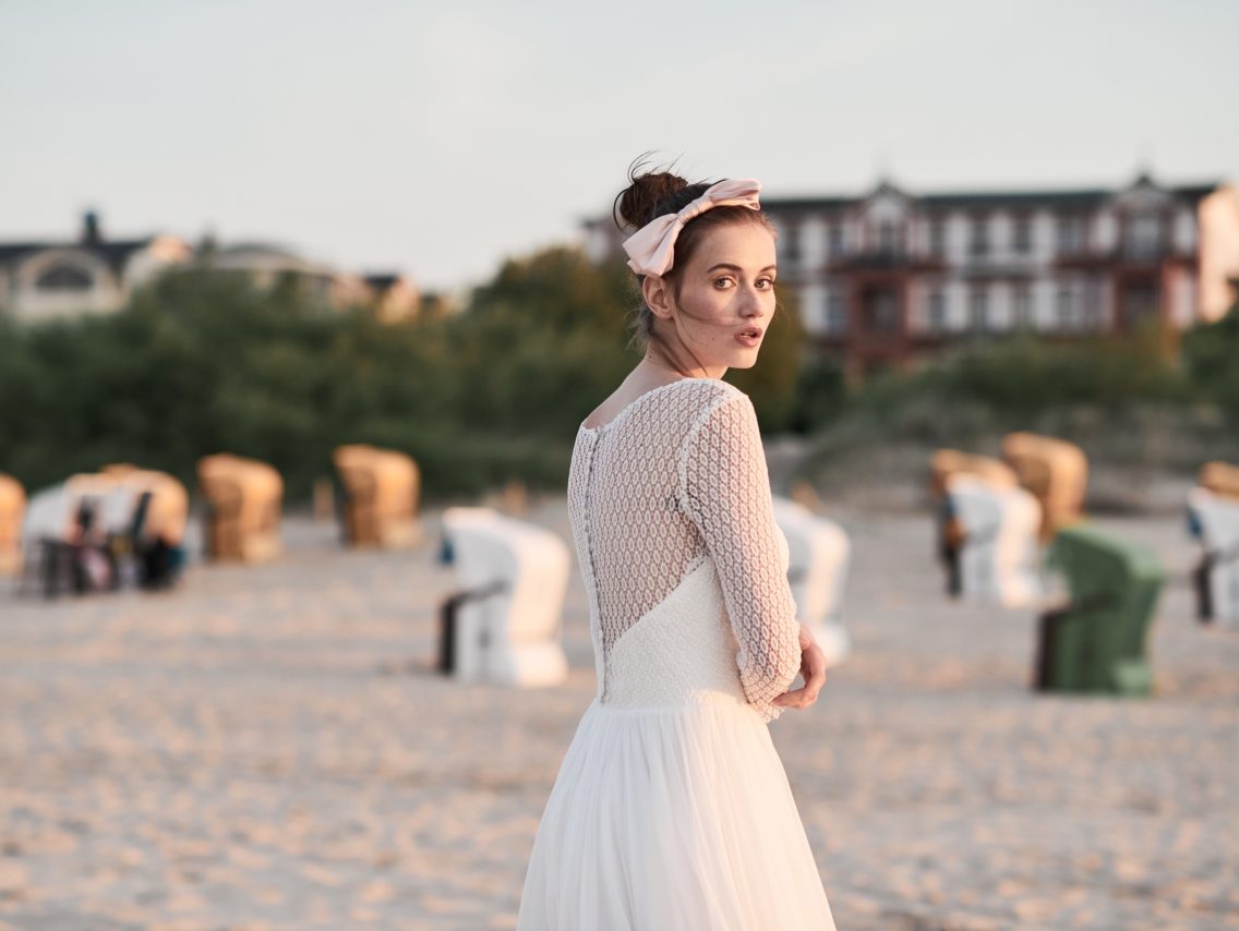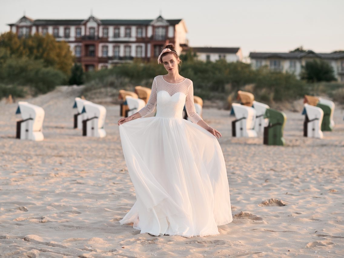 Lekka suknia ślubna w kształcie litery A. Gorset w kształcie serca pokryty koronką. Zabudowany dekolt oraz rękaw 3/4 z gipiurowej koronki. Dół sukni tworzy zwiewny jedwab. Plecy pokryte koronką zapinane na guziczki.