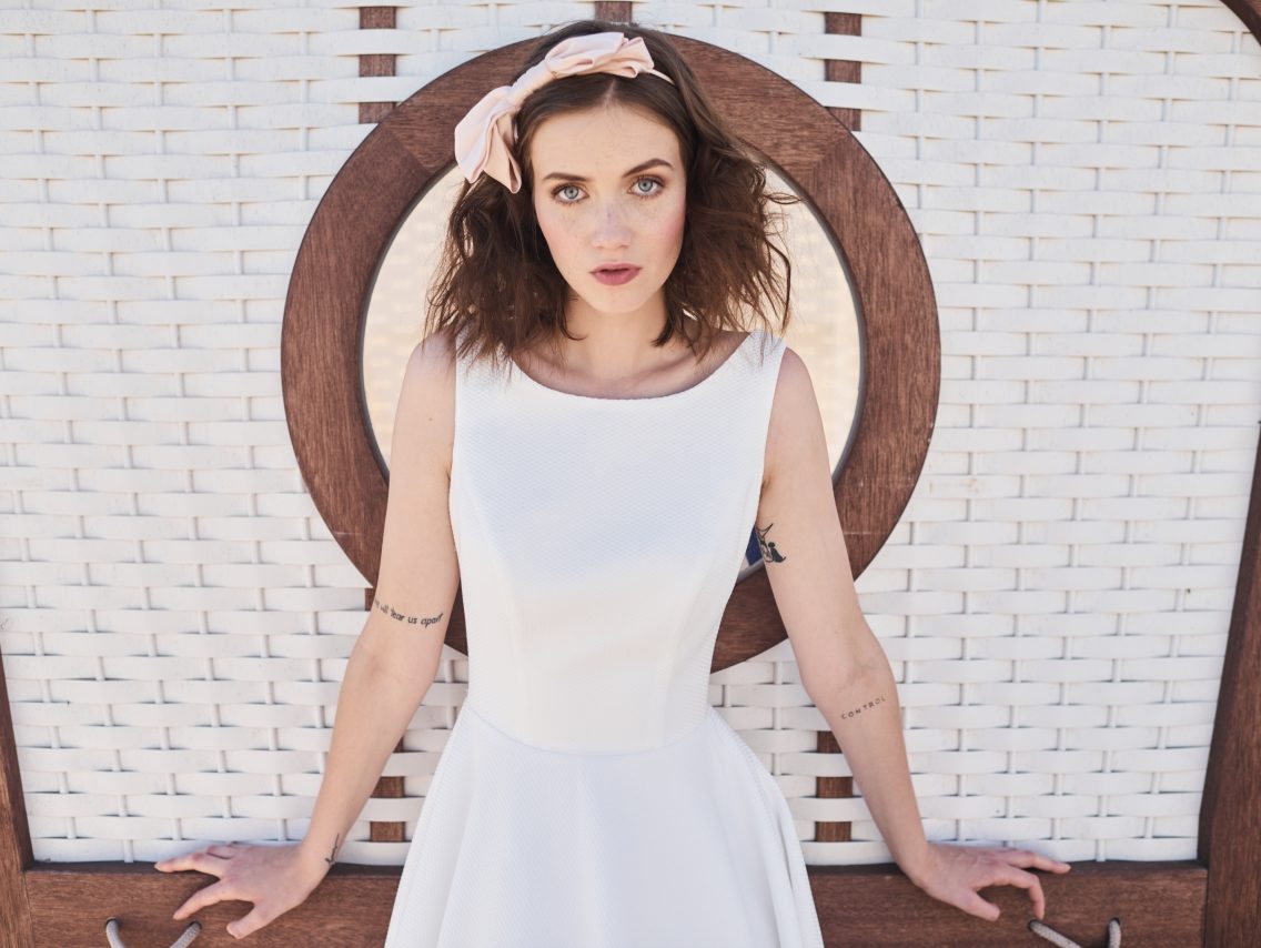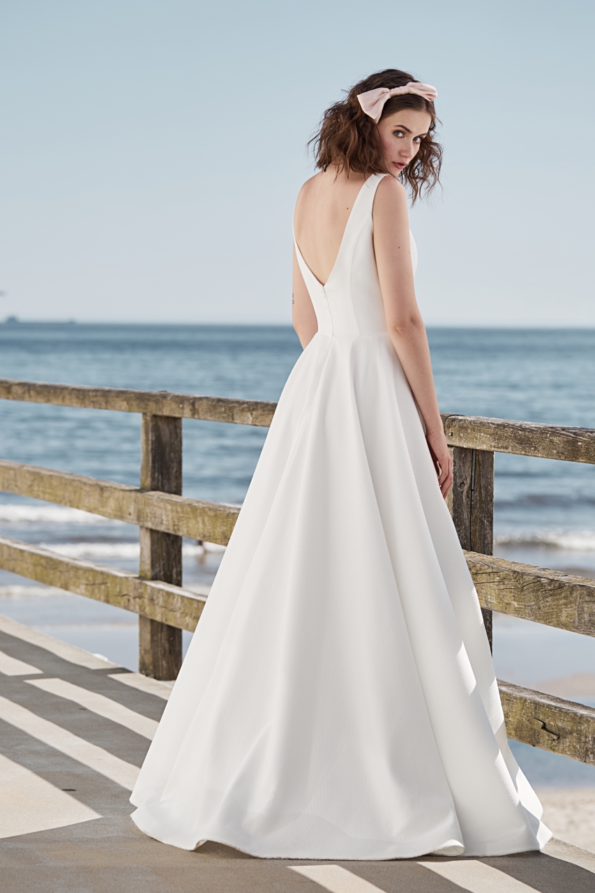 Klasyczna, prosta, gładka suknia w kształcie litery A z prążkowanego żakardu. Zabudowany dekolt na grubych ramiączkach. Plecy pięknie wycięte w literę V. Propozycja bardzo elegancka i urocza.