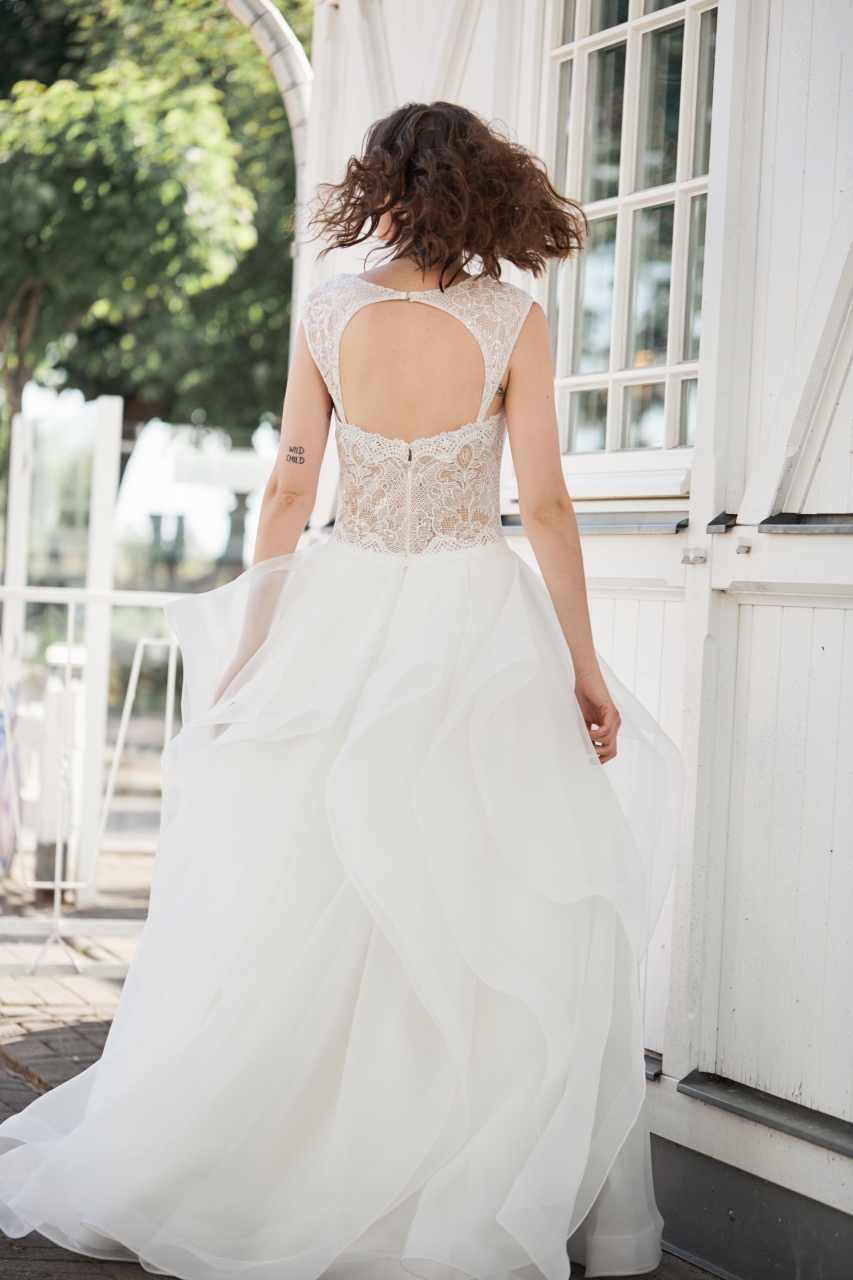 Suknia ślubna z organtyny i koronki typu księżniczka. Koronkowy dekolt w kształcie serca efektownie odsłania ramiona. Dół z warstwowo ułożonych falban z organtyny. Dodatkową wersją jest suknia z koronkowymi ramiączkami.
